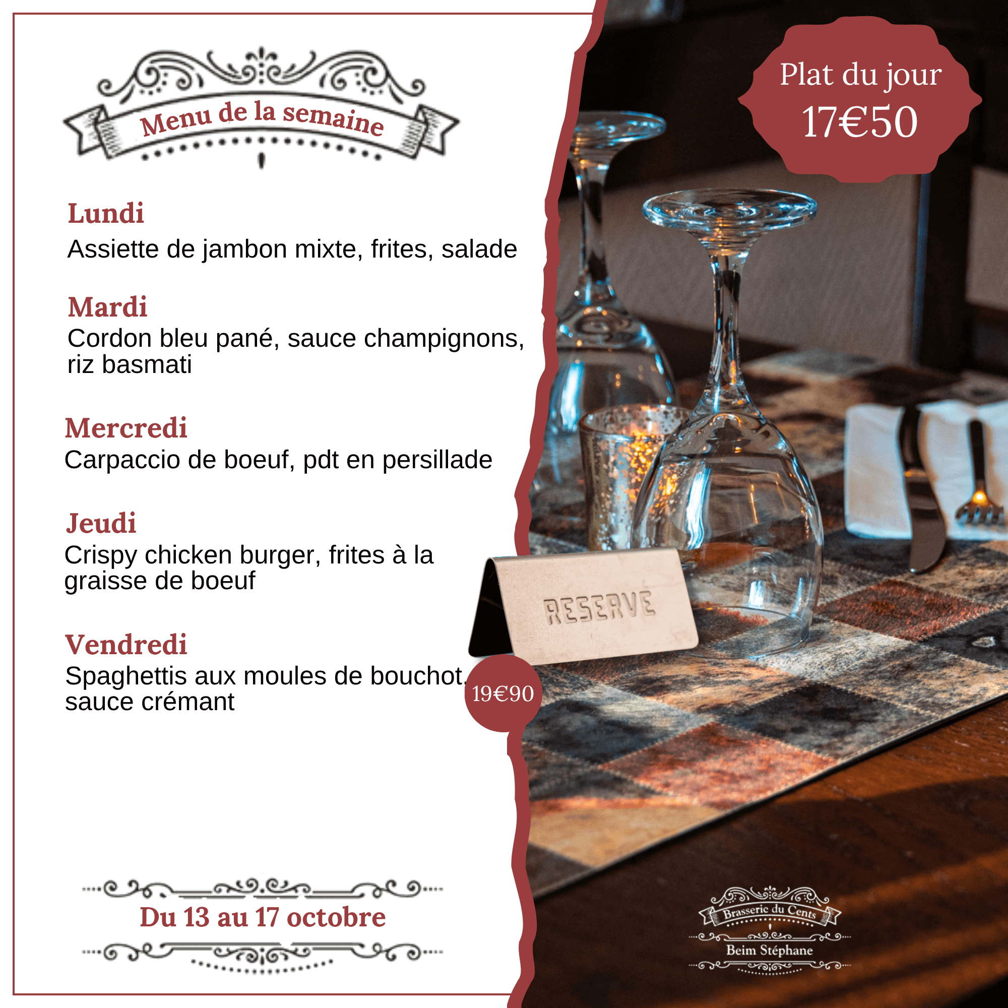 Venez savourer un bon repas dans votre brasserie à Luxembourg ! La Brasserie du Cents vous fait partager son amour de la bonne cuisine ! Entrée dans une ambiance chaleureuse et familiale et laissez-vous servir. Ici, c’est comme à la maison, mais en mieux (la vaisselle, ce n’est pas vous qui la faites). N’hésitez pas à venir vous retrouver en famille, entre amis, en amoureux ou même en solo, nous réservons le même accueil à chacun d’entre vous !